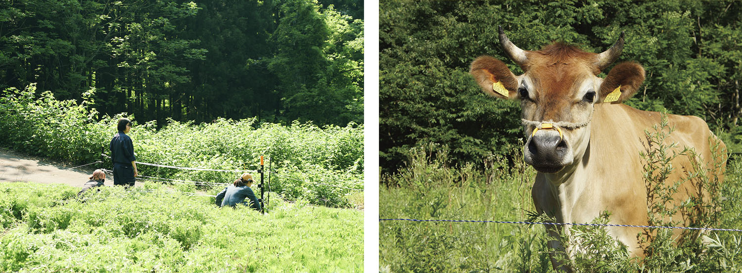 豆腐を製造する過程で出るおからを耕作放棄地に放牧した牛の飼料とし、その畑で原料の大豆を育てる